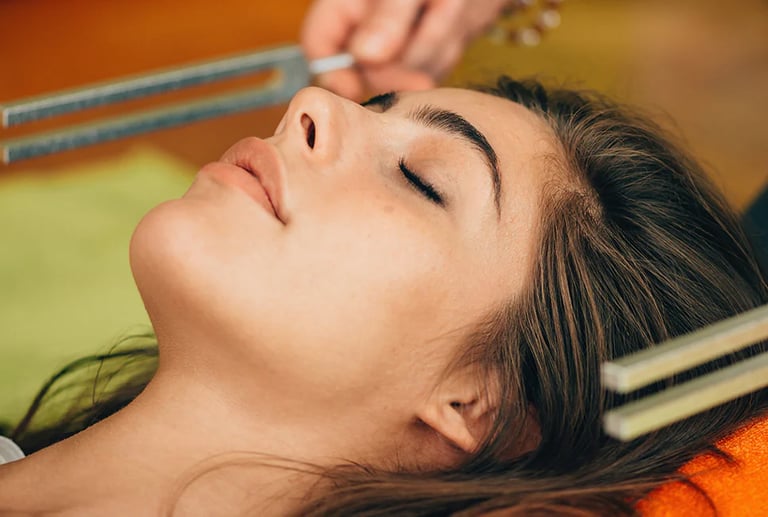 Vous resterez habillé(e) sur une table de massage, tandis que je travaille autour de votre corps en écoutant et réagissant aux changements harmoniques produits par les diapasons.