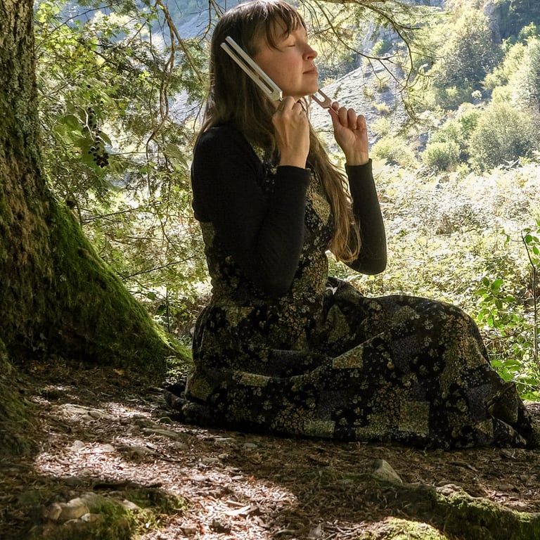 Je pourrai également placer des diapasons pondérés sur des points spécifiques du corps pour soutenir l’alignement énergétique et favoriser l’auto-régulation du corps.